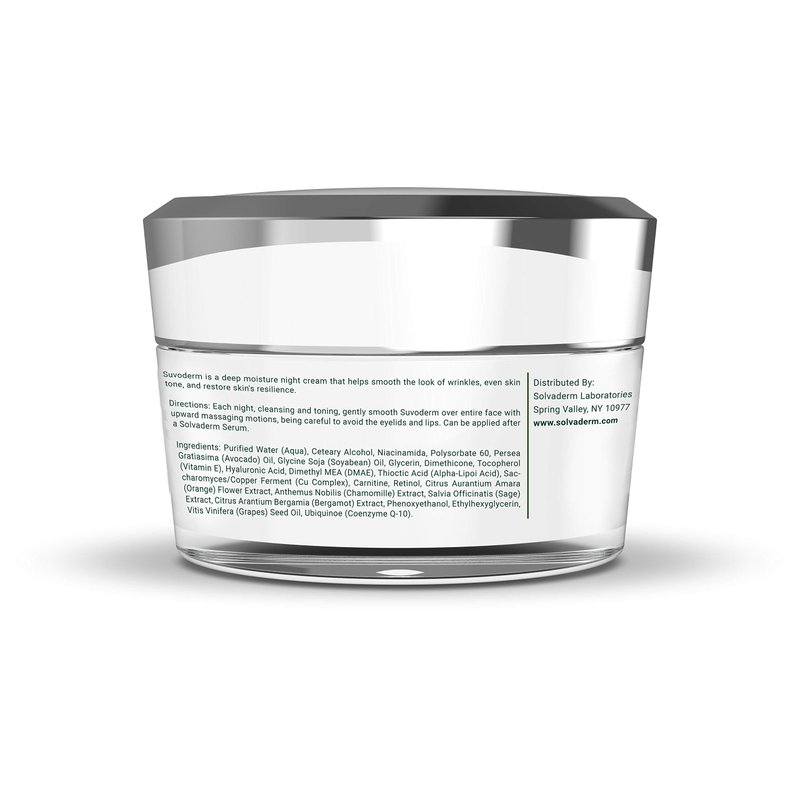Suvoderm is a multi-action, overnight solution developed to rescue and repair your skin and rejuvenate your complexion. It strengthens the structure of your skin, improving its elasticity and firmness, and delivers intensive moisture that 'plumps' away fine lines and wrinkles, giving your skin a more even texture. Suvoderm’s formula contains natural skin brighteners that fade age spots, scars, and other hyperpigmented areas to even out your skin’s tone, and antioxidants to combat free radical damage. This all-in-one professional strength treatment helps you attain healthier, younger-looking skin that’s more resilient to signs of aging. Suvoderm has numerous anti-aging effects and addresses a variety of skin issues found in skin of all ages.
