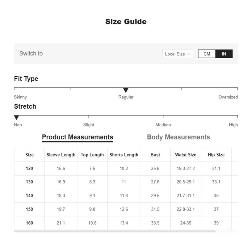 Size Chart:120=6-7Y: Sleeve Length: 15.6", Top Length: 7.5", Shorts Length: 10.2", Bust: 25.6", Waist Size: 19.3-27.2", Hip Size: 31.1", Cuff: 7.6", / 130=8Y: Sleeve Length: 16.9", Top Length: 8.3", Shorts Length: 11", Bust: 27.6", Waist Size: 20.5-29.1", Hip Size: 33.1", Cuff: 7.9", / 140=9Y: Sleeve Length: 18.3", Top Length: 9.1", Shorts Length: 11.8", Bust: 29.5", Waist Size: 21.7-31.1", Hip Size: 35", Cuff: 8.2", / 150=10Y: Sleeve Length: 19.7", Top Length: 9.8", Shorts Length: 12.6", Bust: 31.5", Waist Size: 22.8-33.1", Hip Size: 37", Cuff: 8.5", / 160=11-12Y: Sleeve Length: 21.1", Top Length: 10.6", Shorts Length: 13.4", Bust: 33.5", Waist Size: 24-35", Hip Size: 39", Cuff: 8.8"