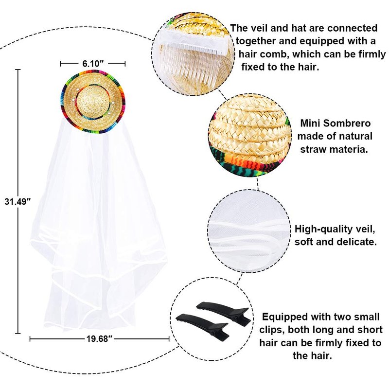 - COMFORTABLE & DURABLE : The the veil is made with two soft layers of tulle cut with elegant rounded edges with a clear heavy duty comb. There are two layers of netting and a slightly shorter layer on top gives the veil a nice fullness. The sombrero has two large alligator clips to hold it in place for all the dancing you’re about to do.