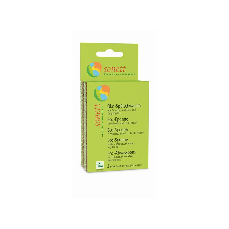 Is your skin reacting to your normal sponge? Or just don't like the idea of washing your dishes with a synthetic piece of foam? Our sponge is made of cellulose, sisal fibers and recycled PET. Is can be composted, and is perfect for travel or camping when you want to minimize waste. The Sonett eco-sponge won't scratch your pots and dishes and is perfect for delicate glasses and stainless steel. Reserve one for hand-washing dishes and the other for any other use where a sponge is handy. Each pack contains 2 dual-surface sponges. The sponge side is 100% cotton cellulose fibers. The abrasive surface is 60% sisal, 40% recycled PET plastic. Adhesive bonding is polyurethane.