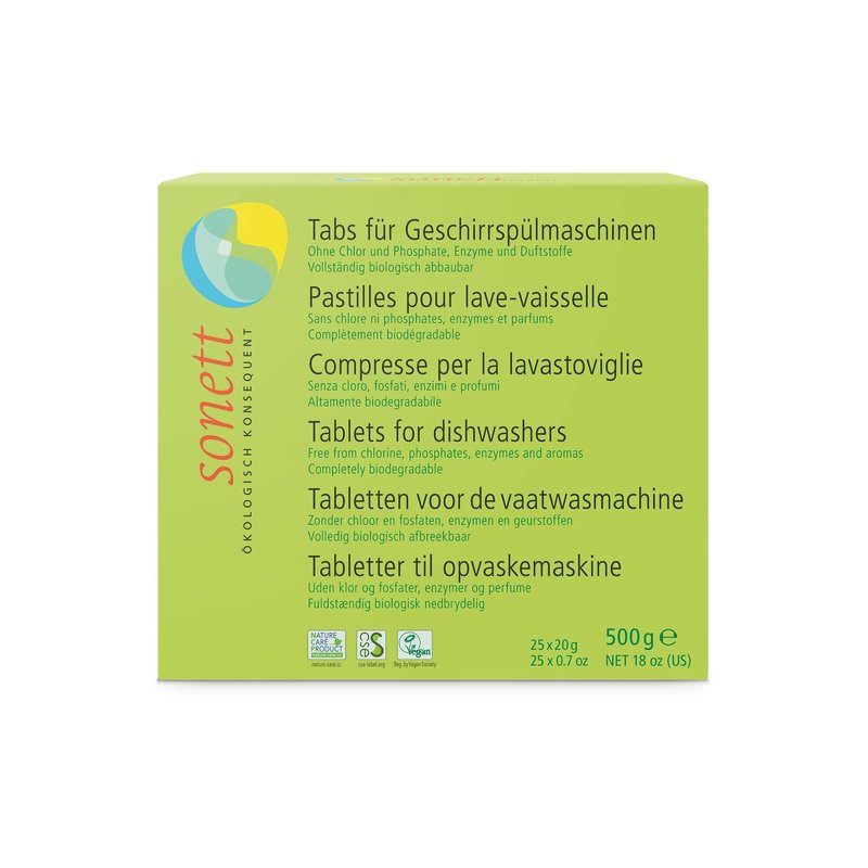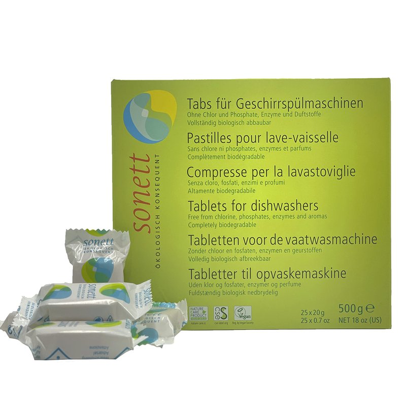 - SUITABLE FOR DISHWASHERS: Sonett Tablets for dishwashers free from chlorine, phosphates, enzymes and aromas. This suitable only for dishwashers with adjustable water softener and they contain minerals and fully biodegradable components.