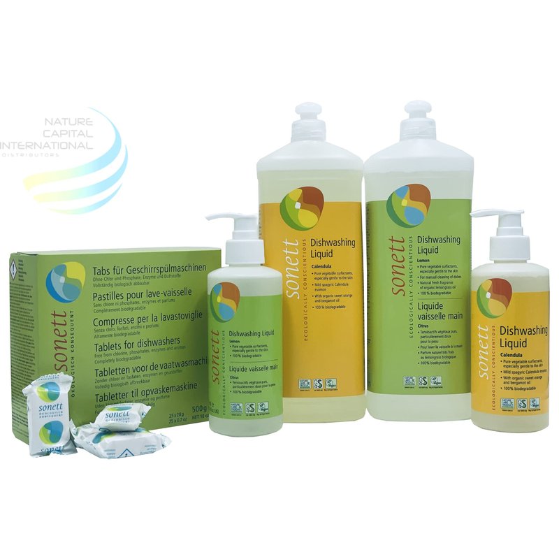 The Sonett tablets contain minerals and organic constituents which are completely biodegradable. They contain no enzymes, no aggressive chlorinated bleaching agents, no phosphates, and no fragrances. The main active ingredients of the Sonett Tablets for Dishwashers are sodium carbonate, silicates, and sulfated castor oil. They make food leftovers swell, emulsify and dissolve fat. Bleaching oxygen (sodium percarbonate) serves for removing tea and coffee residues from glasses and cups. Sonett Dishwasher Tablets are completely biodegradable, and are completely free from chlorine, phosphates, enzymes and aromas. These all natural dishwasher tablets use Citrate and polyasparagin acid (a protein occurring in snails and mussel shells, but petrochemically reproduced) to effectively clean all your dishes leaving them sparkling clean.