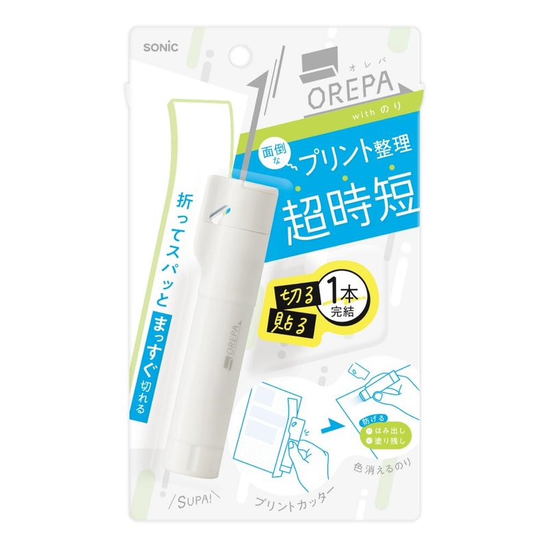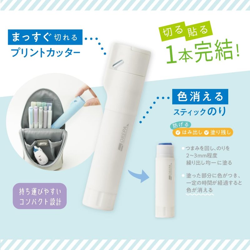 The SONIC Orepa with glue stick is a multifunctional stationery tool designed to streamline the organization of class handouts and enhance efficiency. Combining a paper trimmer and a color-disappearing glue stick in one compact device, it allows users to cut and paste materials seamlessly with a single instrument.