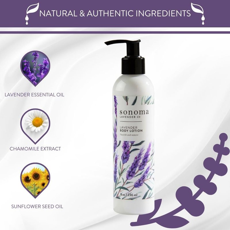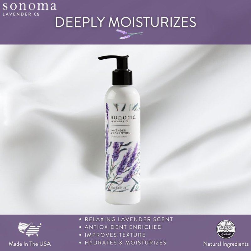 Sonoma Lavender Co. luxuriously fragrant body lotion soothes, hydrates and heals dry, rough skin. Made with pure lavender essential oil, our lotion will calm and relax you while moisturizing your skin leaving it soft and smooth.