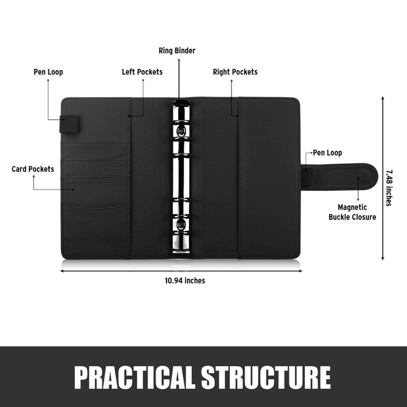 - Practical Structure: Sooez six ring binder is structured with a convenient magnetic buckle closure, 4 card slots and 2 pockets for passport/ tickets/notes etc, 1 stainless steel 6-ring (0.79 in diameter) binder and 2 pen elastic loops keep your pens at your fingertip, recording your life anywhere, anytime.