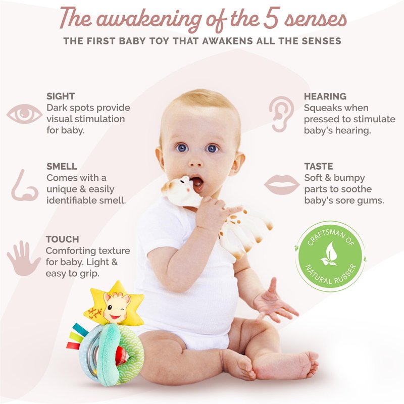 - SENSORY: Sophie has dark contrasting spots and a flexible, soft, lightweight body with many parts to chew (ears, horns, legs). She's also equipped with a unique whistle when squeezed. The plush rattle is filled with beads and has easy-to-grip handles. Jingle the beads to entertain baby!