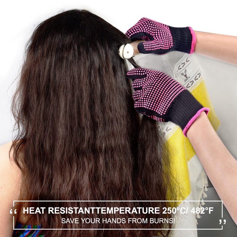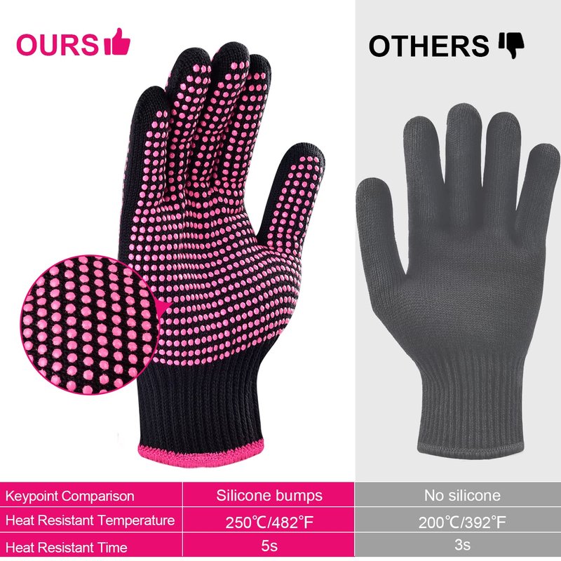 - Heat Resistant Top Quality Gloves: With thermostable silicone nodules on the surface, our gloves can provide your hands better isolation from hot hair tools when a instant touch of the hot iron(no more than 5s), the protection limit temperature can up to 250℃/ 482°F. WARM TIPS: The gloves are not designed for cooking or grilling , can not be used for holding hot pots ,handling hot food