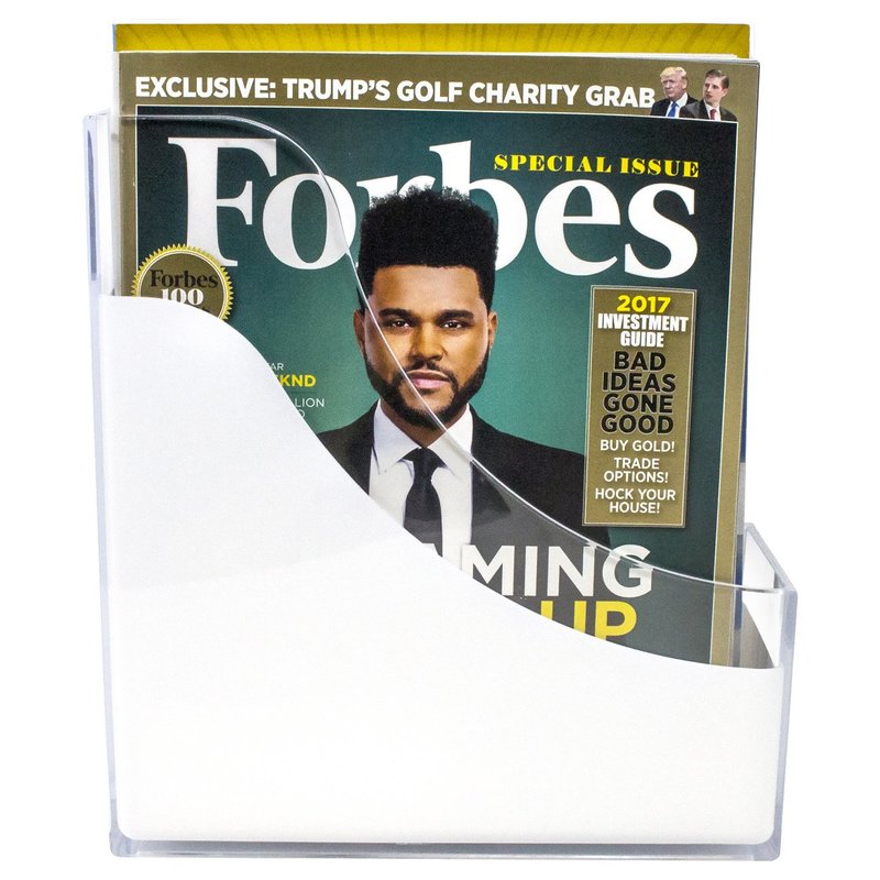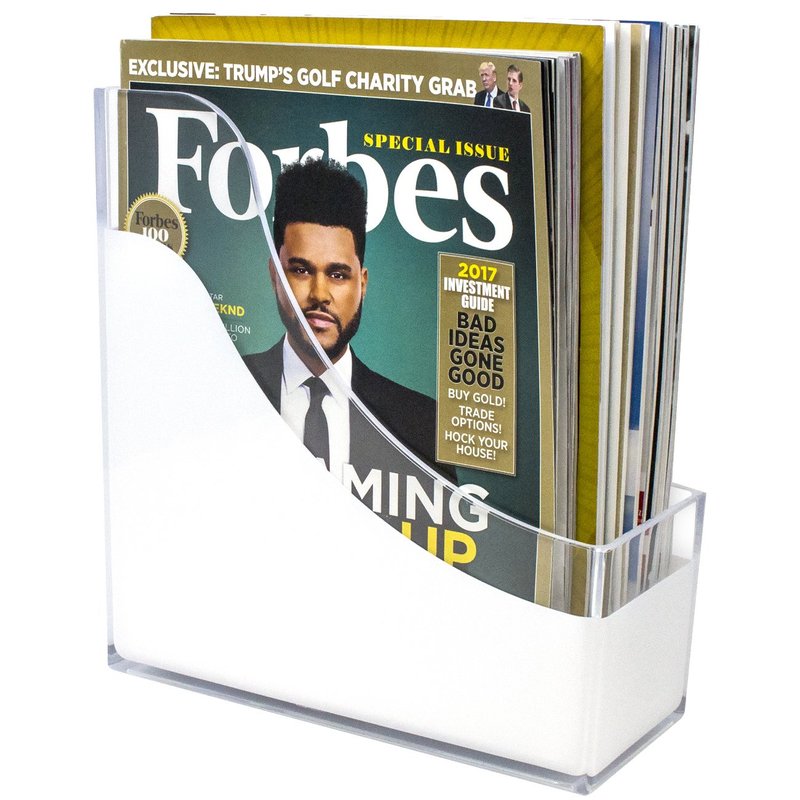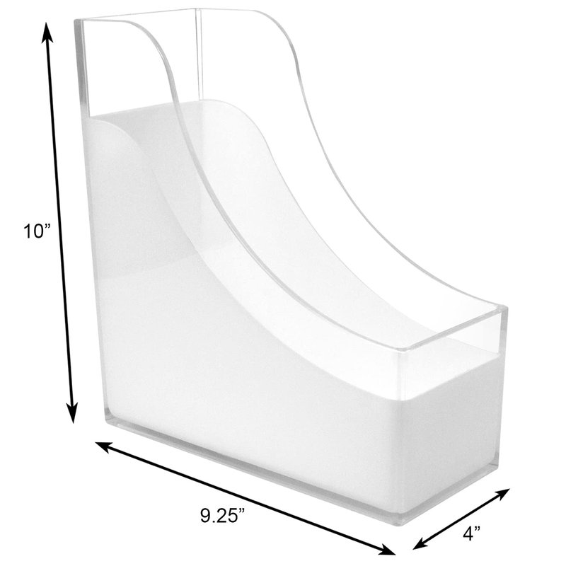 Accent your workspace with the Sorbus Magazine Holder and File Organizer. Dress your desk with a magazine file holder that features a sleek aesthetic to quickly access magazines, periodicals, files, mail, and more. As an alternative to cluttered drawers, this smartly designed unit adds space virtually anywhere keeping items tucked away with a clear view. Whether placed in the home or office, this versatile organizer keeps your reading or printed material visible and accessible. Gather your favorite tech, fashion, or home décor magazines so the latest trends are always at your fingertips! This compact holder is great storing your favorite magazines but versatile enough for multi-purpose use. Use it as a paper rack for the office, black book organizer, file tray stand, desk folder organizer tray, letter sorter desktop, book collection organizer, folder holder, and much more to quickly meet that project deadline. As your collection grows, add multiple holders and place them side by side for a zen level of organization. When paired with our Desktop Organizer Set and File Tray (sold separately) you’ll create a beautifully upgraded space with style and function. Designed for anyone from Executives, Administrative Staff, Bloggers, Students, and more. Modern and sleek clear acrylic mixed with white lacquer-like finish. Great gift for busy and organized professionals Complements any décor. Suitable for compact spaces like studios, cubicles, shelves, and drawers. Sturdy and lightweight. Measures approximately 9.25" L x 4" W x 10" H Pair with our 3-Piece Desk Organizer Set and File Tray (sold separately) for additional style and storage!