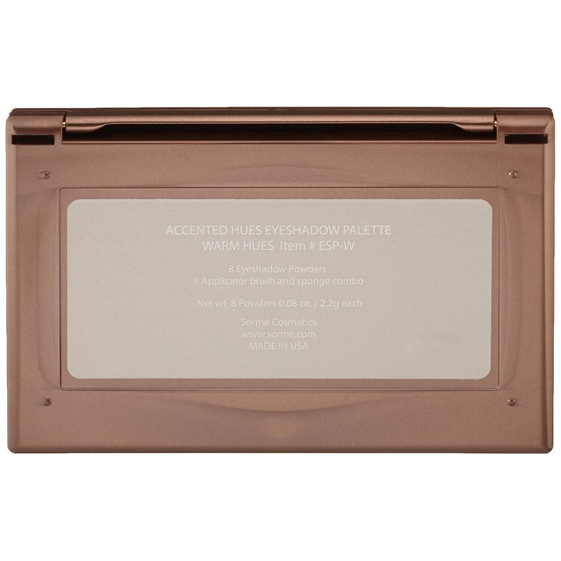 - YOUR GLAM ESSENTIAL: Get a variety of eye-catching looks with Sorme Cosmetics Accented Hues Eyeshadow Palette in Warm. It features 8 pans of richly-hued golden browns and neutral eyeshadows in various metallic, shimmer, and matte finishes.