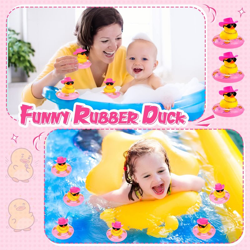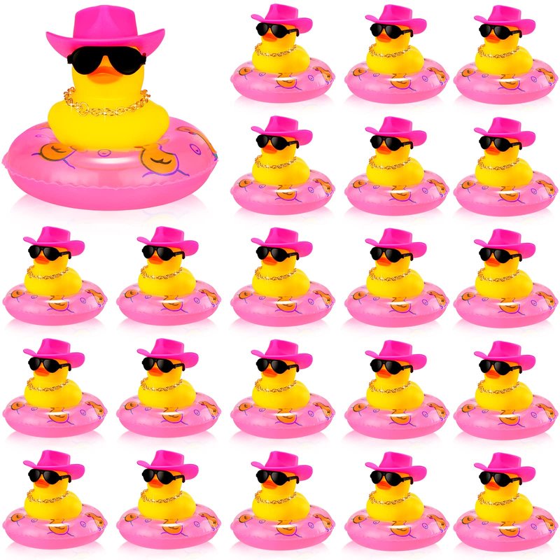 - Funny Duck Decorations: you will receive 24 pieces of funny rubber ducks, each measuring about 2.17 x 1.77 inches/ 5.5 x 4.5 cm, equipped with a mini rose cowboy hat, swim circle, necklace and sunglasses; The ducks have interesting shapes and are suitable for decorating cars, offices, bedrooms and desks to add some fun and relieve your stress