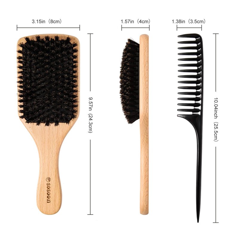 100% BOAR BRISTLE HAIR BRUSH: Sosoon boar bristles are from wild boars raised on small farms in rugged terrains and climate conditions. Boar bristles spread hair oil from the scalp to the tail of hair, heal dry and frivolous hair while removing excess oil, keep shiny and improve hair texture.