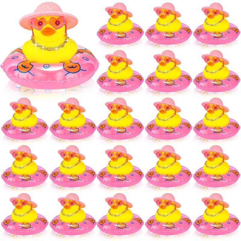 - Package Includes: you will receive 24 sets of funny rubber ducks, one set includes a yellow rubber duck, a pink mini sun hat, a swimming ring, a gold necklaces and a pair of sunglasses, the combination of rubber duck, sun hat, swimming ring, necklace and sunglasses is a good decoration, plenty, you can meet your daily needs or party decoration needs, you can also share with your family or friend