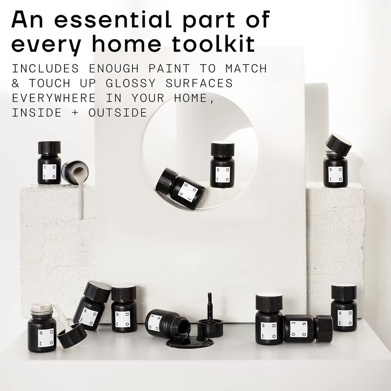 Soto Appliance and Porcelain Paint Touch Up is for use on appliances and porcelain in kitchens and bathrooms, including on sinks, bathtubs, home appliances, metal surfaces, tile, and fiberglass. It is ideal for use over scratches, stains, and cracks on to disguise defects, even on difficult-to-coat glossy surfaces. The high-gloss formula is engineered to deliver a durable, seamless repair for both interior and exterior applications. Paint is streak-free and easy-to-apply using the included, professional-grade, mess-free brush tip. The high-quality glass bottle with a screw-top stores easily and securely for repeat use. Soto Appliance and Porcelain Paint Touch Up is a water-based, acrylic paint that is ultra low odor and low-emission for healthier indoor air quality. Each bottle includes 10 milliliters of high-gloss paint with a brush attached to the cap. Made by hand in the USA.
