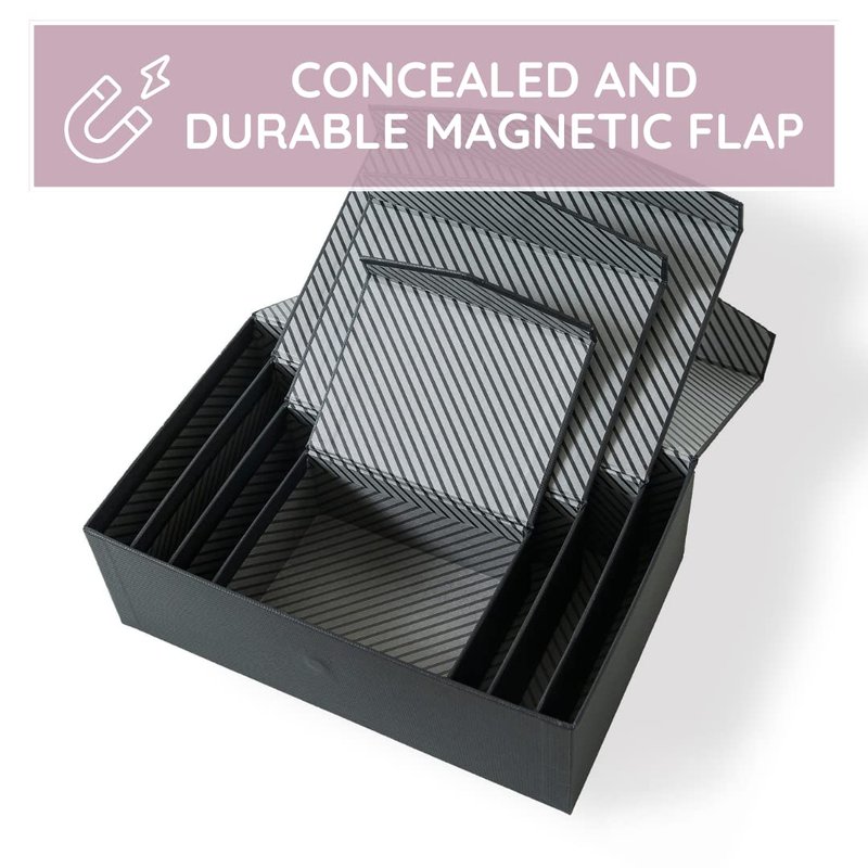 Elevate your gifting and organization game with our chic black decorative boxes adorned with magnetic lids. This set of 4 small reusable cardboard gift boxes is the epitome of sophistication and functionality. Each box is enveloped in textured matte black paper, revealing a whimsical white and black diagonally striped pattern inside, merging elegance with a playful character.