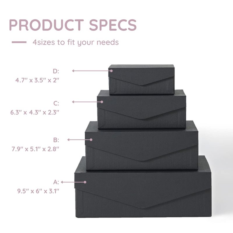 - SET OF FOUR NESTING BOXES: Each nesting gift boxes set comes with 4 boxes with lids in different versatile sizes that can be nested within each other: A: 9.5" x 6" x 3.1", B: 7.9" x 5.1" x 2.8", C: 6.3" x 4.3" x 2.3", D: 4.7" x 3.5" x 2".