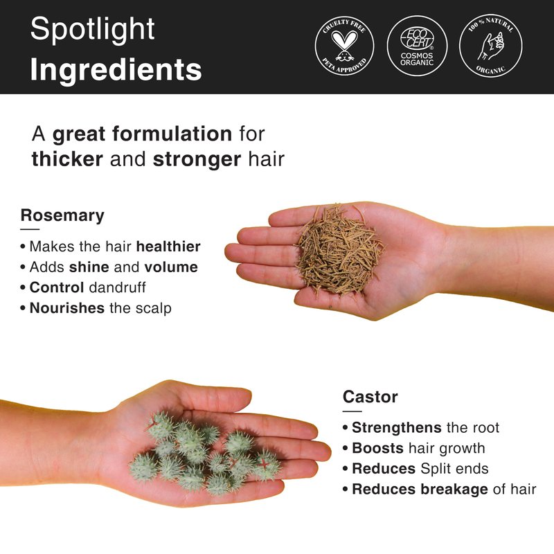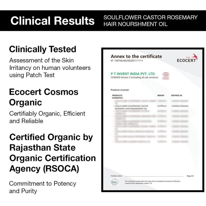 - CERTIFICATION: Soulflower Castor Rosemary Hair Oil is ESG Certified, ECOCERT COSMOS ORGANIC Certified, Vegan, Preservative, Mineral Oil, SLS & Chemical Free.