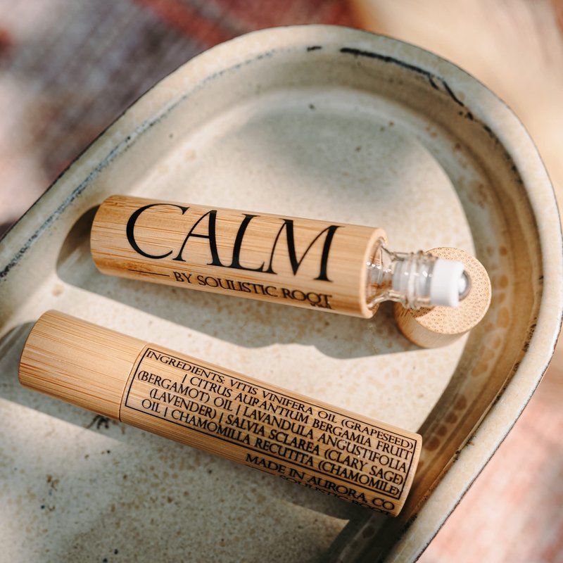 - Calm essential oil roll on - made with a calming blend of grapeseed oil, chamomile, clary sage, bergamot and lavender essential oil. This stress relief blend of essential oils can be applied throughout the day to help unwind and support relaxation.