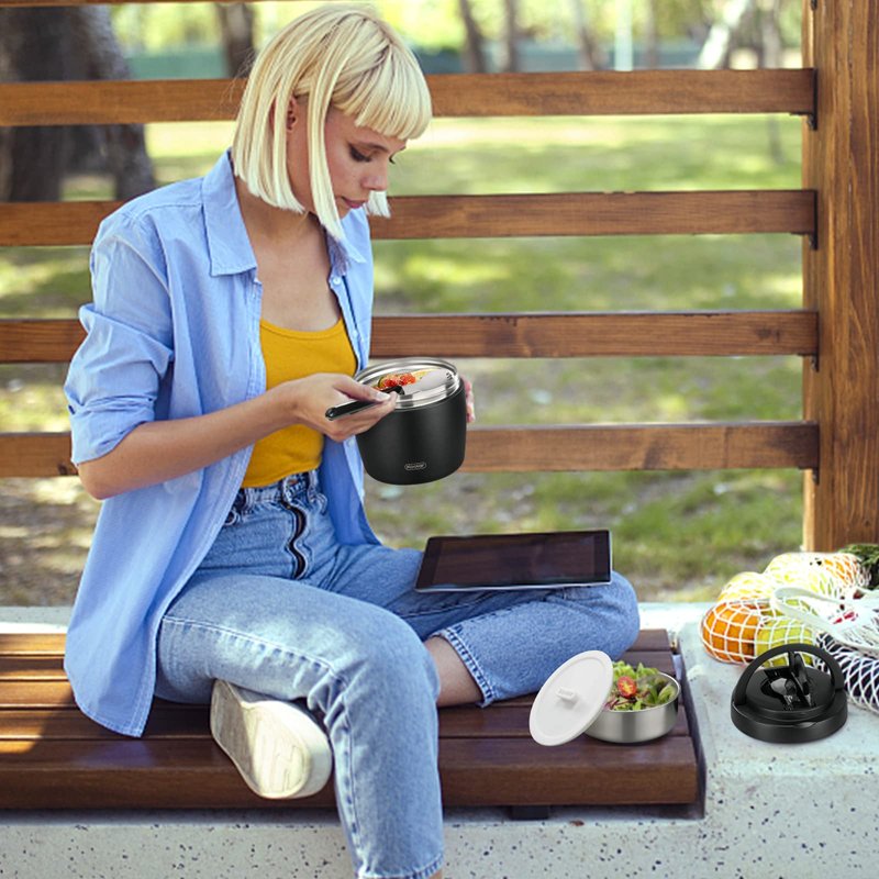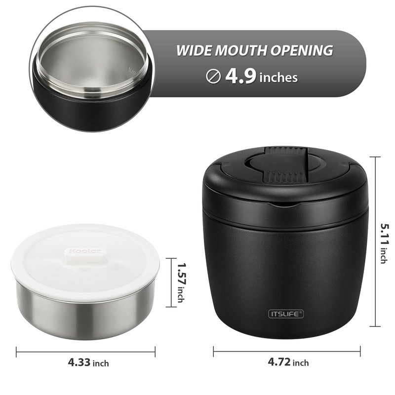 - The screw cap design with seal washer guarantees 100% leak-proof, the hidden handle and hidden folding spoon are designed for easy opening and carrying, and the bottom silicone pad prevents the food jar from moving or tumbling.