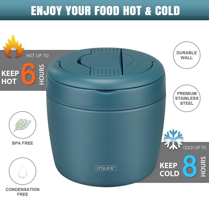 - The interior of the food thermo is completely made of food-grade double-wall vacuum insulated stainless steel. The durable heat insulation technology keeps the food hot for 6 hours or cold for 8 hours. No matter where you are at lunch time, you can enjoy warm food and soup!