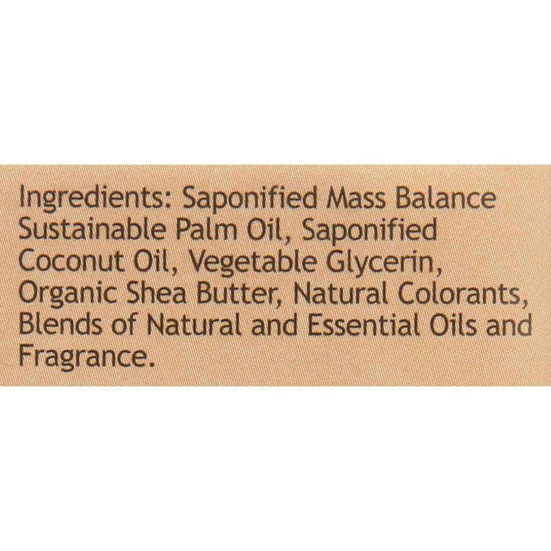 Sustainable Mass Balance Sustainable Palm Oil, Saponified Coconut Oil, Vegetable Glycerin, Organic Shea Butter, Natural Colorants, Blends of Natural and Essential Oils and Fragrance