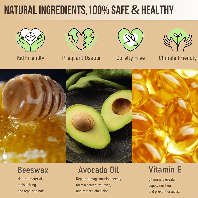 - Gentle: The hair wax stick content of natural plant ingredients such as Beeswax, Avocado Essencel, Vitamin E deeply nourish hair, repair damage, restore elasticity, delay aging, super-long moisturizing, and say goodbye to dry hair!