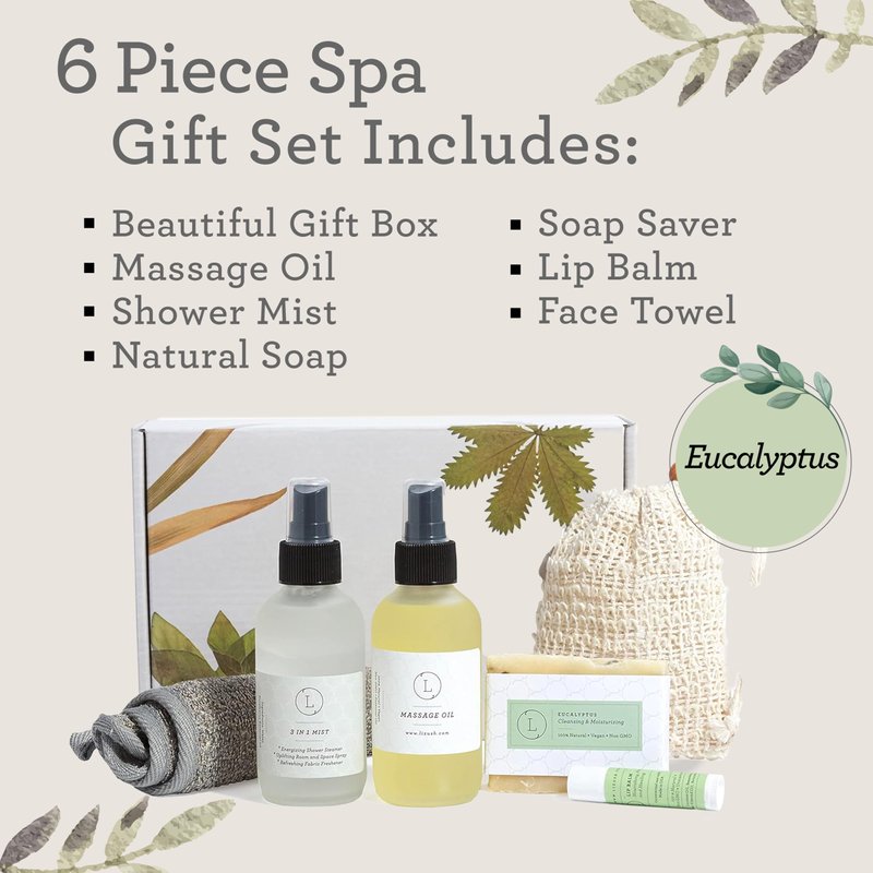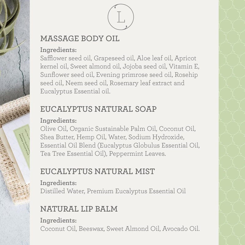 - Includes: ❀ Massage oil - 4 oz (Glass bottle) ❀ Shower mist - 4 oz (Glass bottle) ❀ Eucalyptus natural soap ❀ Eucalyptus natural soap ❀ Soap saver ❀ Natural Lip Balm ❀ Face Towel ❀ Gorgeous New Elegant Box