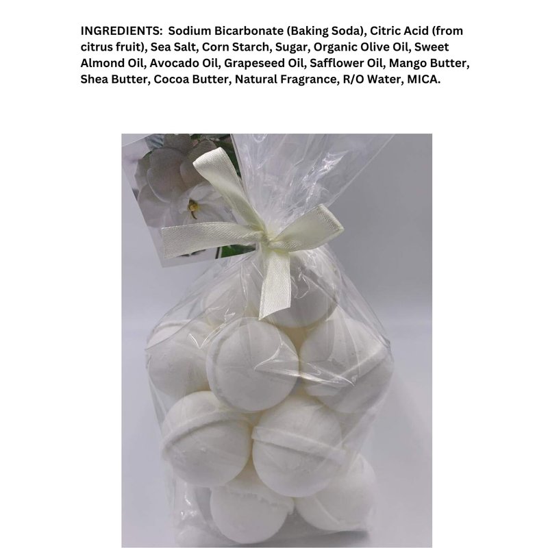 Our Gardenia luxury bath bombs come in packs of 14 (one ounce each). They are made with skin ingredients including Shea, Mango, and Cocoa Butter that and replenish your skin. Bathing with bath bombs is far better than lotion. The body's natural oils will lock in the skin with all-natural and 100% pure ingredients, many oils are Kosher too. Ultra moisturizing bath bomb fizzies are great for all skin types, especially for dry skin. Receive 14 bath bombs in a clear cello bag with a hang tag.