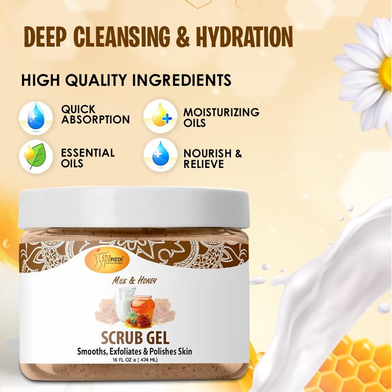 SPA REDI – Exfoliating Scrub Pumice Gel, Milk and Honey, 16 Oz - Manicure, Pedicure and Body Exfoliator Infused with Hyaluronic Acid, Amino Acids, Panthenol and Comfrey Extract