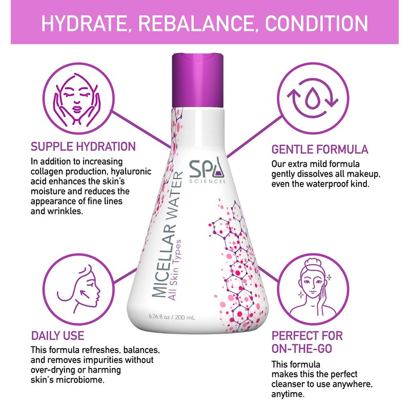 No time to rinse? No problem. Our MICELLAR WATER gently cleanses the skin and removes makeup, all in one step. Soothing natural extracts repair the skin’s protecting layer while treating irritation. Free of fragrances, parabens, and silicone, this Micellar Water will keep your skin happy and healthy. Our extra mild formula gently dissolves all makeup, even the waterproof kind. It refreshes, balances, and removes impurities without over-drying or harming skin's microbiome. Chamomile and arnica extracts possess soothing properties to help fight redness. Seaweed extract protects the skin’s natural balance while regulating oil production. In addition to increasing collagen production, hyaluronic acid enhances the skin’s moisture and reduces the appearance of fine lines and wrinkles. Your skin’s outer layers will look more plump and radiantly hydrated. This micellar water is ideal for daily use and may be used before or in lieu of a cleanser. Simply saturate a cotton pad and gently wipe over your closed eyes, face, and lips. Then, repeat using a new cotton pad until clean. Don’t worry about rinsing the product when you’re done, and you can follow up with other products if needed. Spa Sciences is committed to providing safe and affordable beauty and skincare treatments for home use to help you obtain the results you want. Our products truly allow you to “bring the spa home with you.”