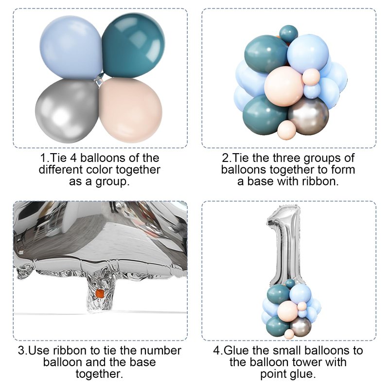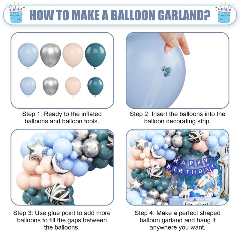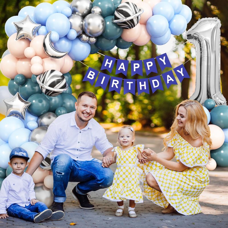 - Outer Space Balloon Arch Kit: 32inch silver number 1 balloon x 1, blue HAPPY BIRTHDAY banner x1, 10inch silver foil balloons (moon, star)x1, pastel blue balloons (18x10in, 5x5in), pastel orange balloons (18x10in, 5x5in), dusty blue balloons (15x10in, 5x5inch), metallic silver balloons (5x10in, 5x5in), marble agate balloons(4x10in), long balloons (white, metallic silver) x2, white ribbons x1, 16 feet balloon strip x1, glues point x50. Suitable for you to decorate your kid's 1st birthday party.