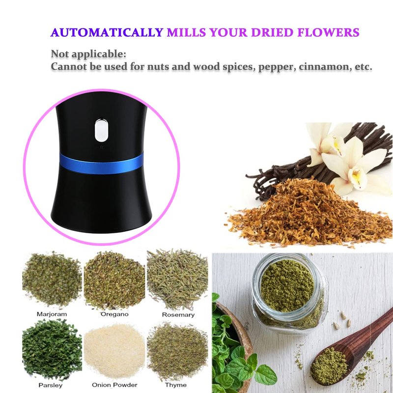 - Built-in 1100 mAh rechargeable battery: Can be used for several weeks, so you can enjoy your perfect rotate any place or time. Automatically mills your dried flowers and fills them into an awaiting sachet or cone. Equipped with two more plastic jars with lid, you can hold more. Not applicable: Cannot be used for nuts and wood spices, pepper, cinnamon, etc.