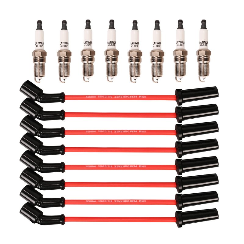 Spark Plug Wires Set 9748HH 8.0mm Red + 41-962 Spark Plugs Compatible with Cadillac Escalade, Chevy Silverado Suburban Tahoe GMC Sierra Yukon 16-Pack