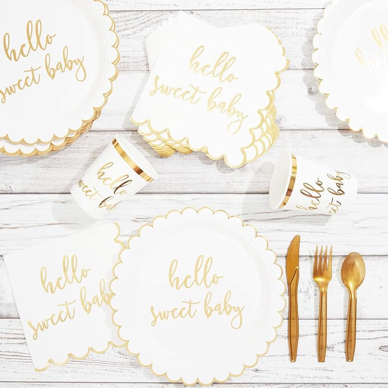 - EASY PARTY PREP & DECOR: Don’t make decorating harder than it should be; complete your birthday party decor with our "Hello Sweet Baby" themed paper plates. The vibrant gold foil accents will definitely add a lovely touch to dining tables