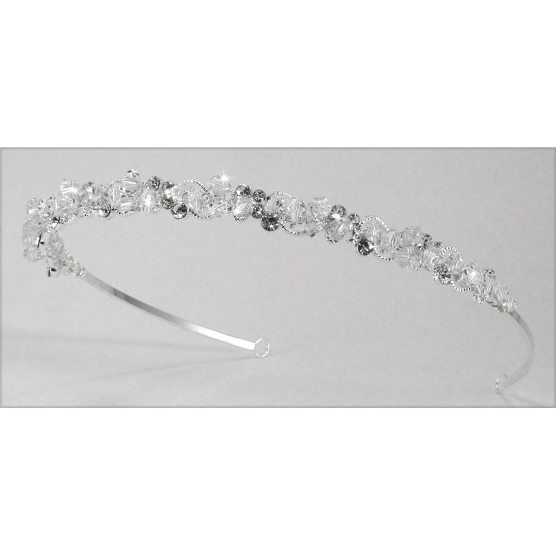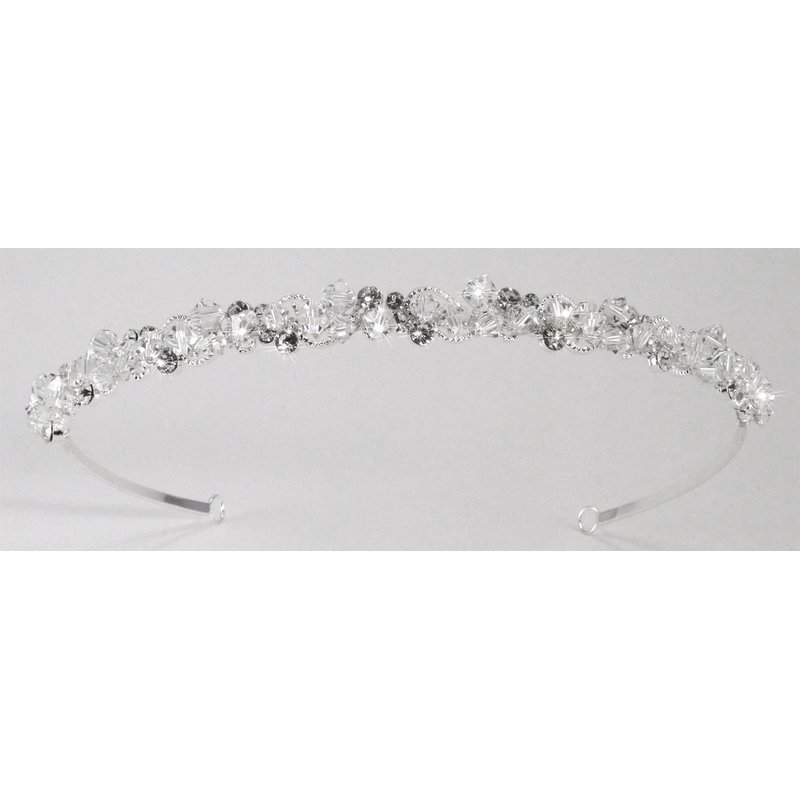 This sparkling and beautiful headband tiara of Austrian rhinestone & crystal beads is your perfect headpiece for any special occasions such as wedding, prom, and quinceanera. The ornamented section measures about 9 inches by 1/2 inch at tallest point, with pin loops at both ends to help securing the piece to hair.