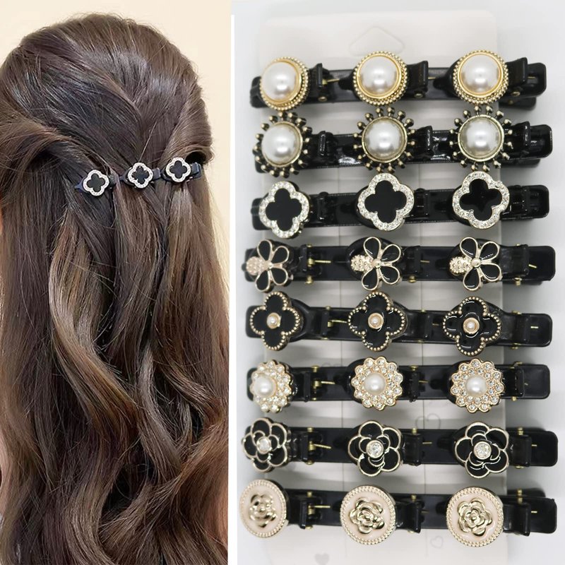 Sparkling Crystal Stone Brained Hair Clips, Clover Rhinestone Hairpin Duckbill Clips Satin Fabric Hair Bands Barrette Pins for Women and Girls (Vintage-8pcs)