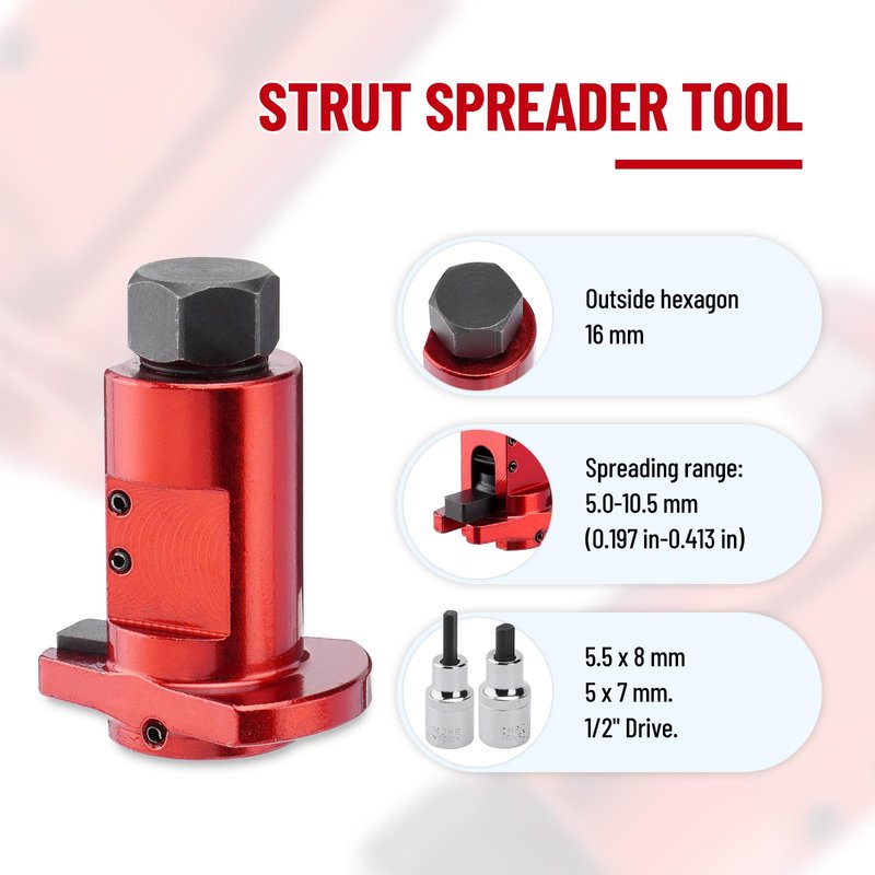 - Strut Spreader Tool: Spreading range: 5.0 – 10.5 mm, Drive: Outside hexagon 16 mm. And include 2 piece strut spreader tool with 5.5 x 8 mm and 5 x 7 mm. 1/2" Drive.