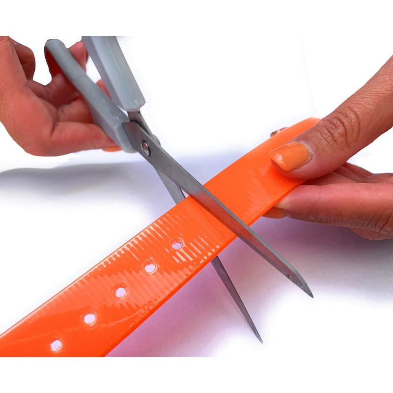 30 sizing holes are spaced tightly to allow for a perfect fit. Strap width is 1” inch and the length measures approximately 28 inches from one end of the strap to the other (not including buckle). The unique strap material may be cut to your desired length - no need to worry about the collar unraveling or being damaged.