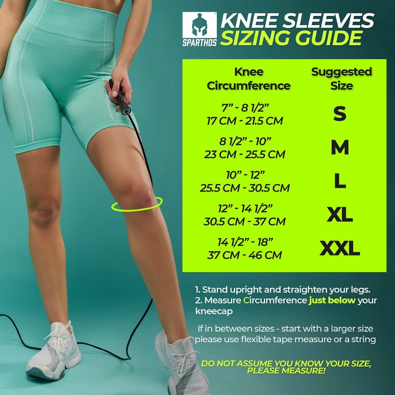 Suffering? Suffering from Stiffness, Soreness, Arthritis, Tendonitis and other knee conditions? Improve your well-being with SPARTHOS Knee Compression Sleeves Looking to reduce your recovery time? Aiming to improve your performance? Sparthos Knee Compression Sleeves are highly versatile and useful to all: Sports: Whether you're looking to reduce your recovery times or improve your performance, these sleeves are going to give you and your thighs a big boost. Useful for running, marathons, hiking, cycling, football, tennis, basketball, triathlons, weightlifting, athletics and much more. Injury prevention: The Innovative compression fabric provides rigidity and support to muscles and is designed to reduce shock waves and vibrations. This helps to prevent muscle tears, pulls, sprains, strains, swelling, joint pain, contractures, micro-injuries and muscle fatigue. Enhanced recovery: After exercise, the Sparthos Knee Sleeves continues to oxygenate the muscles and increases blood circulation. This process reduces the possibility of soreness. Damaged muscles repair quicker meaning you can train and compete on fresher legs. Train, compete and recover with Sparthos. SIZE CHART Please measure circumference just below your kneecap S - Knee Measurement 7 1/2" - 9 1/2" M - Knee Measurement 9 1/2" - 11" L - Knee Measurement 11" - 13" XL - Knee Measurement 13" - 15" 100% HAPPINESS GUARANTEE - BUY with confidence!