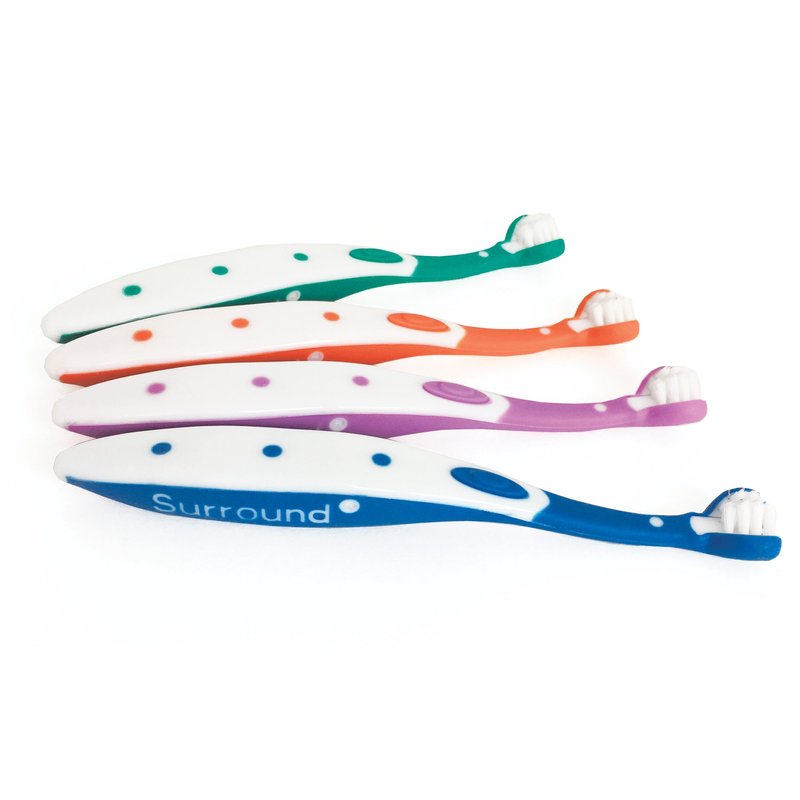 The Surround Toddler Toothbrush has a unique 3-bristle pad design to clean all surfaces of the teeth at the same time. For people who may not brush as long as they should, more tooth surface is cleaned with each stroke. Appropriate for children up to the age of 5.