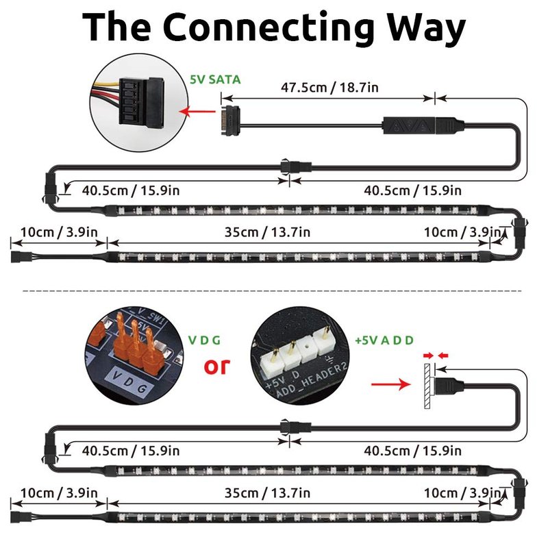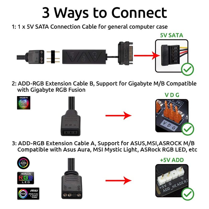 ✔ 2-WAY TO CONTROL: Connected by 5V ADD RGB 3-pin header on Motherboard without using our key controller or SATA connection with RGB header, all kinds of Motherboard can controlled by our key contriller.