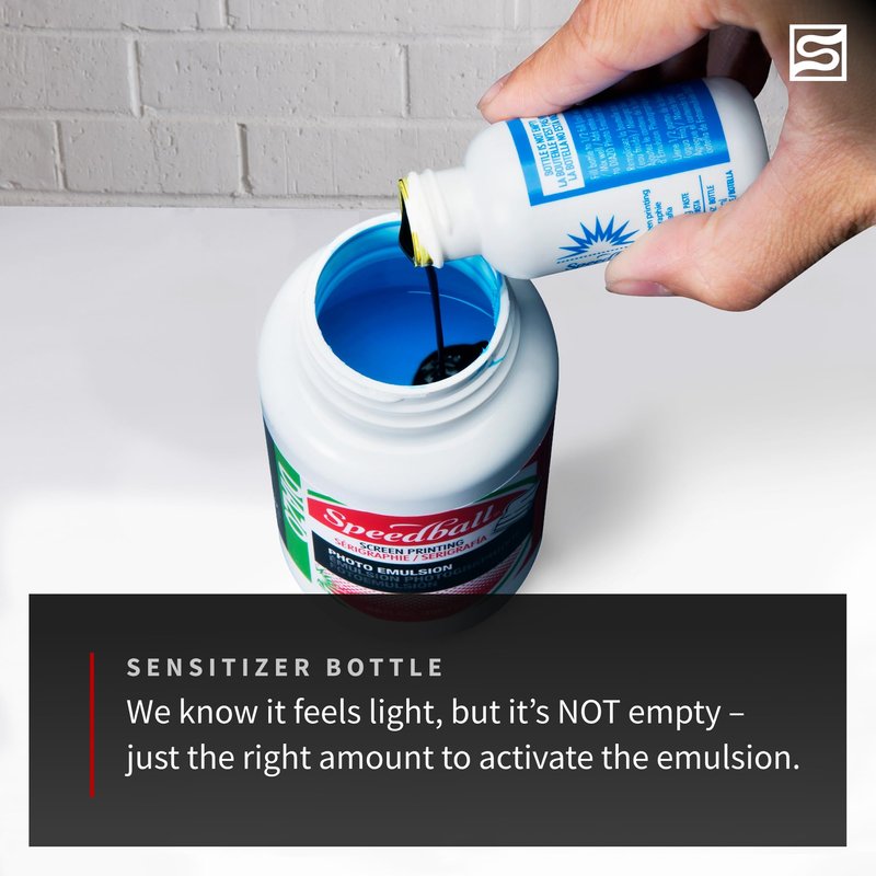 - Speedball’s Diazo Photo Emulsion is a 2-step process where the photo emulsion needs to be “activated.” To activate, the photo emulsion, sensitizer needs to be added. The sensitizer is a very thick oil and needs water to create the right consistency for adding it to the photo emulsion. (The sensitizer bottle will feel unfilled, but don’t worry it is not empty!)