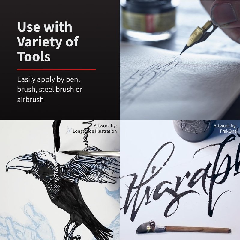 - USE WITH A VARIETY OF TOOLS - Easily applied by pen, brush, steel brush or airbrush, Speedball’s India Ink is free-flowing, non-clogging and waterproof