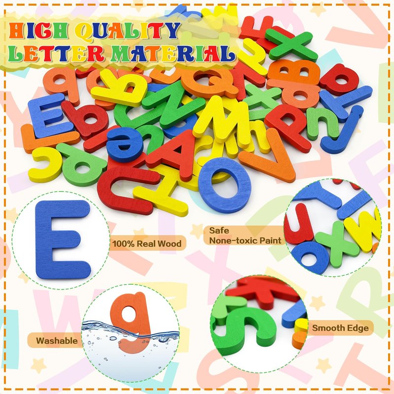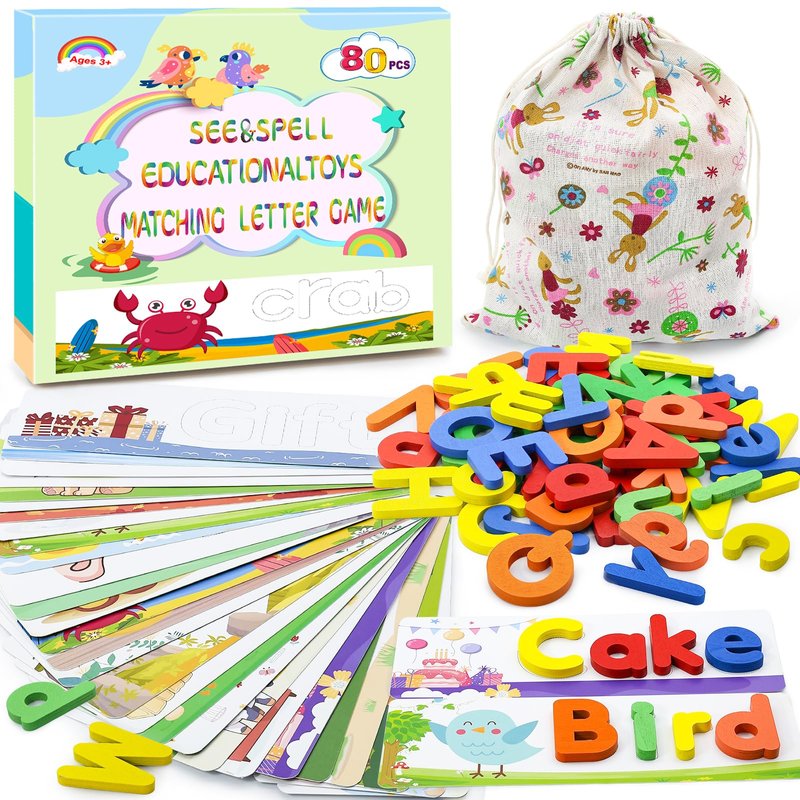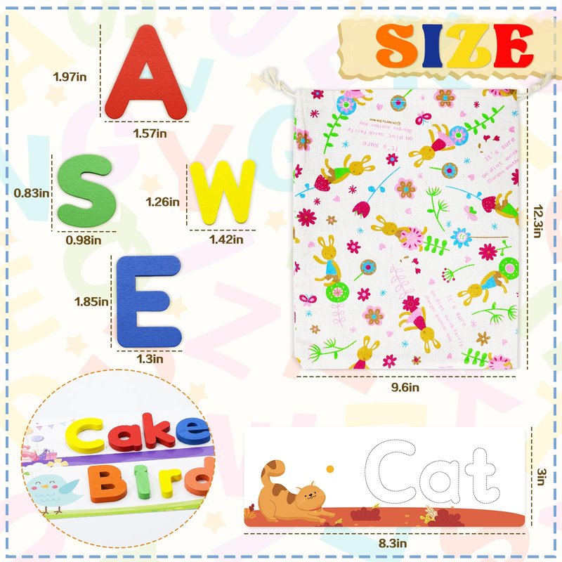 - Convenient Storage: This set includes 28 double-sided letter puzzle flash cards, offering a diverse range of essential CVC words. Each card is crafted from heavyweight, laminated material for durability. Additionally, there are 52 sturdy wooden letter blocks, consisting of 26 uppercase and lowercase ABC letters. Each block making them solid yet easy to handle, even for tiny hands. Lastly, a convenient storage bag is included to foster good toy organization habits among children, ensuring easy portability and storage.