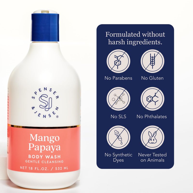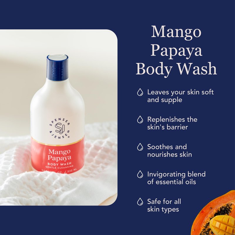 Transform your shower time into a relaxing spa experience with this revitalizing mango and papaya body wash. Our gentle cleansing wash is infused with mango and papaya extract to instantly leave your skin hydrated and nourished. An aromatic blend of oil-free, tropical scents envelops your shower with bliss after a long, arduous day. Whether you have dry, oily, or combination skin, our mango and papaya body wash is formulated to target an array of skin types. Plump and hydrate dull, dry spots with our blend of hydrating ingredients and achieve overall healthier skin when you incorporate our wash into your morning or nighttime routine. It’s also gentle and free of irritants. From The Manufacturer: As a women-founded brand, Spenser & Jensen is committed to providing you and your household with clean products you can trust. That’s why our products are sulfate and paraben free, and you won’t find any harsh ingredients…ever. We pride ourselves on designing a bath and skincare collection for all skin types and for everyone.