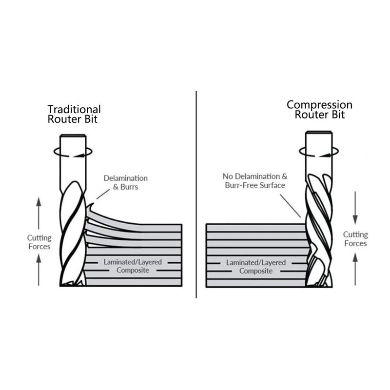 - COMPRESSION CUT. The compression cutters are designed with both up and down-cut flutes, combatting delamination on the top and bottom of a workpiece