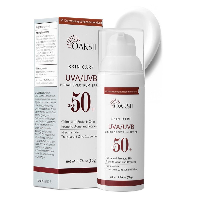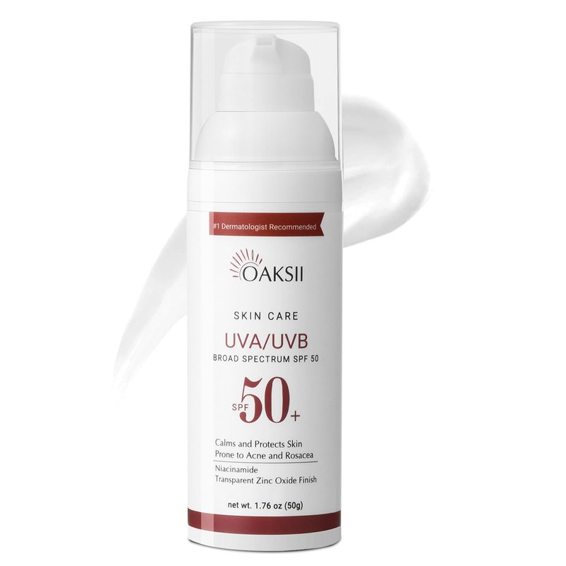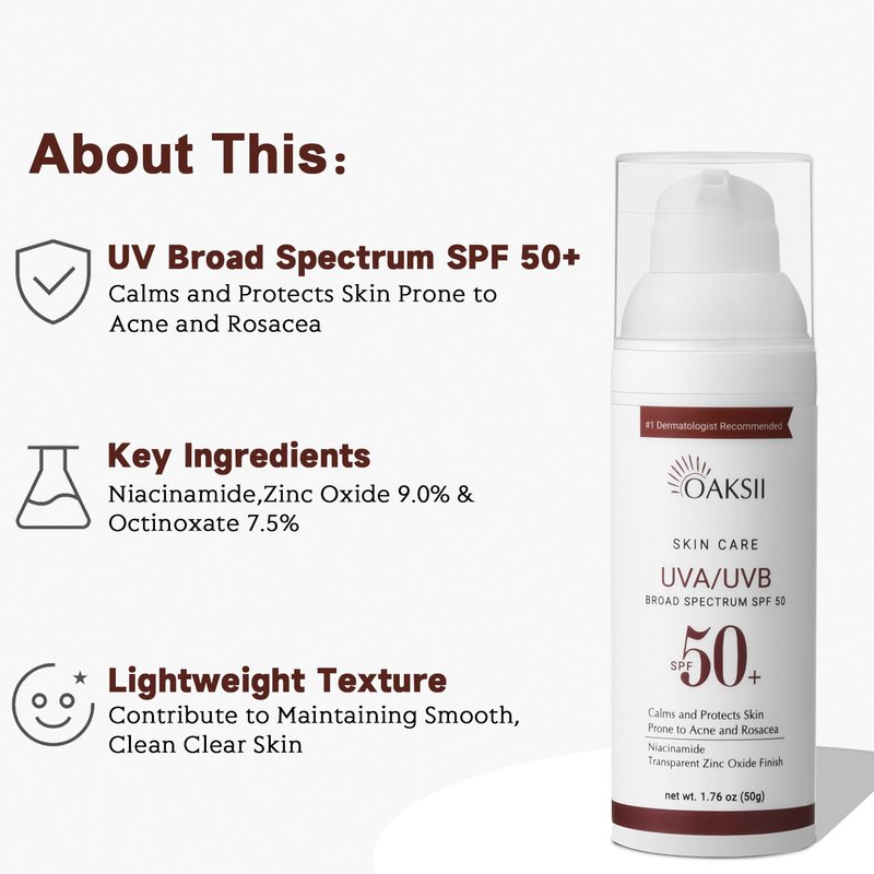 - 【Calms & Protects Acne-prone Skin】Bottle of OAKSII face broad spectrum SPF 50 sunscreen lotion for acne-prone skin. Its chemical-free actives, zinc oxide and titanium dioxide, provide safe but sure sun protection. Protect sensitive skin types prone to discoloration and breakouts associated to acne and rosacea.