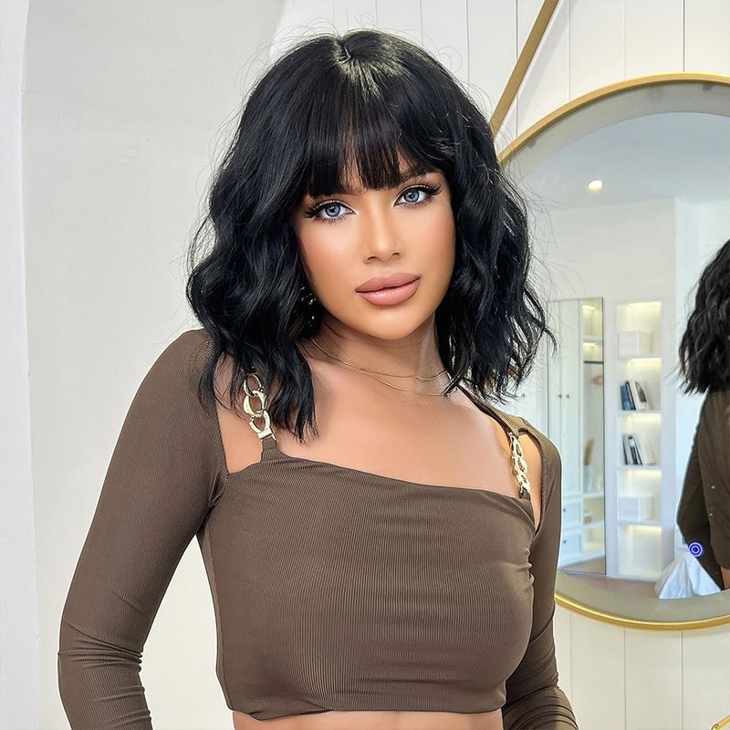 SPFAMI Short Bob Black Wavy Wigs with Bangs for Women Natural Shoulder Length Wig Women's Charming Heat Resistant Synthetic Wigs for Daily Party Use
