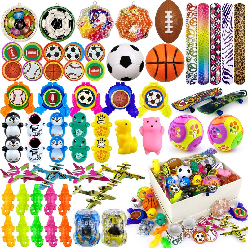 - PACKAGE INCLUDED:You will get 60pcs party favor toys:10pcs crocodile whistles, 10pcs sports rings,10pcs mini tumbler toys,5pcs slap bracelets, 5pcs sport flying discs,5pcs Airplanes,3pcs sports balls,2pcs pull back cars,4pcs mazes, 2pcs mini animal toys, 2pcs finger skateboards,2pcs puzzle balls.