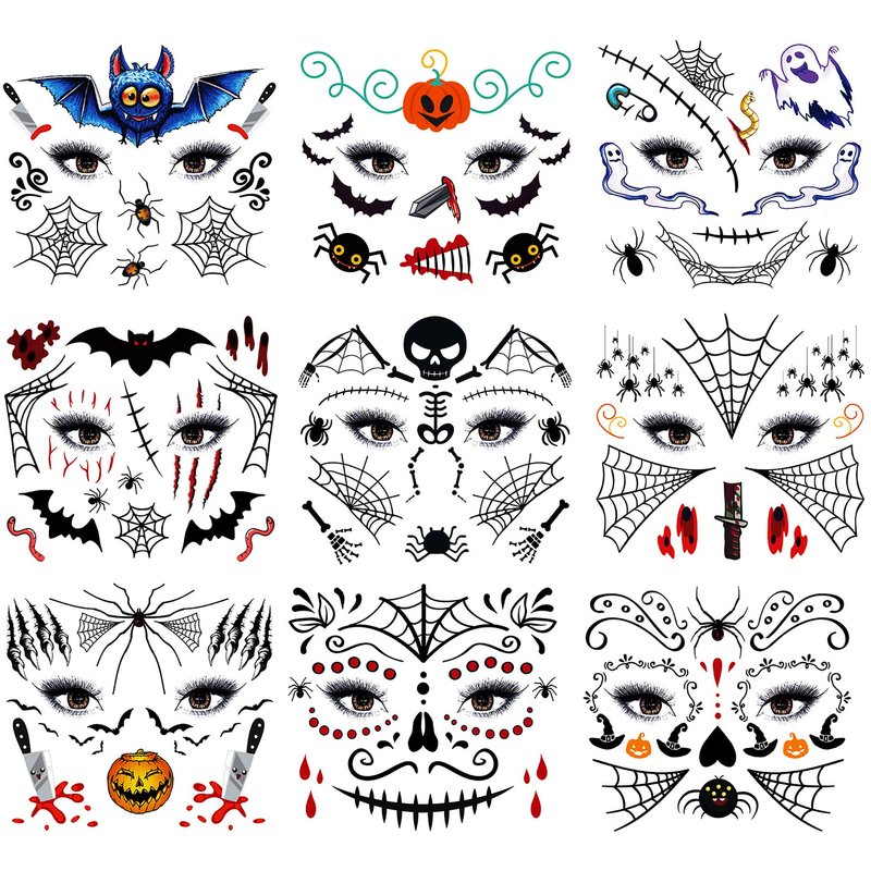 Spider Scar Face Tattoos, 9-Sheet Face Spider Web Mask Prank Temporary Tattoo Stickers Fake Face Scar Blood Realistic Tattoos for Kids Boys Girls Holloween Face Makeup
