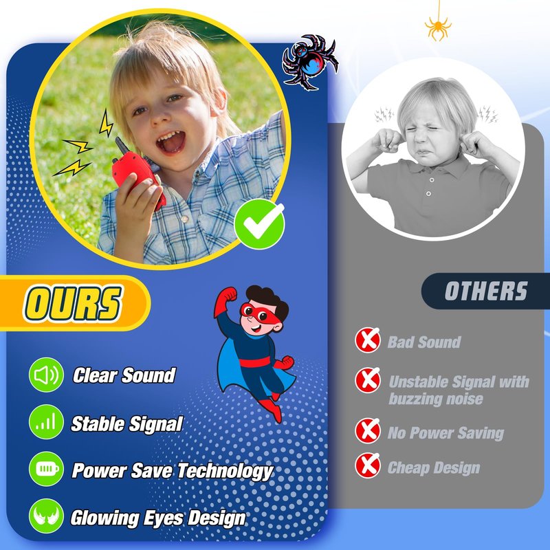 - Super Cool Design: Our Spider walkie talkies for kids are crafted to perfectly fit small hands aged 3-8. With an enhanced size and ergonomic shape, they're easy for kids to grip and play with. Weighing just 70g, these lightweight and stylish walkie talkies are great for kids to carry on their adventures